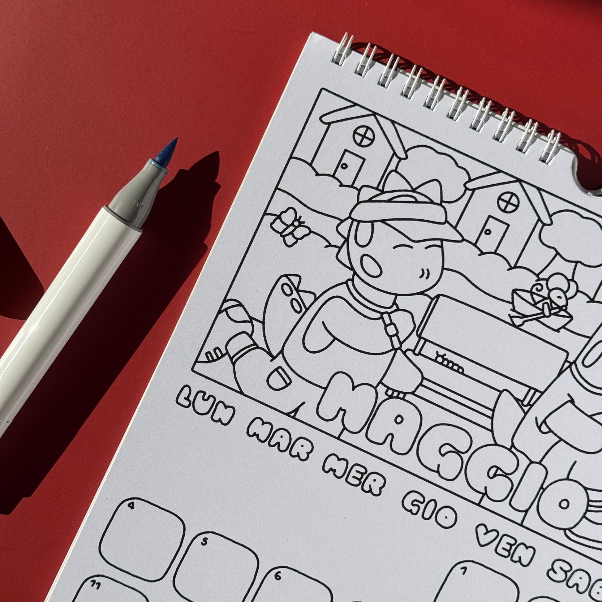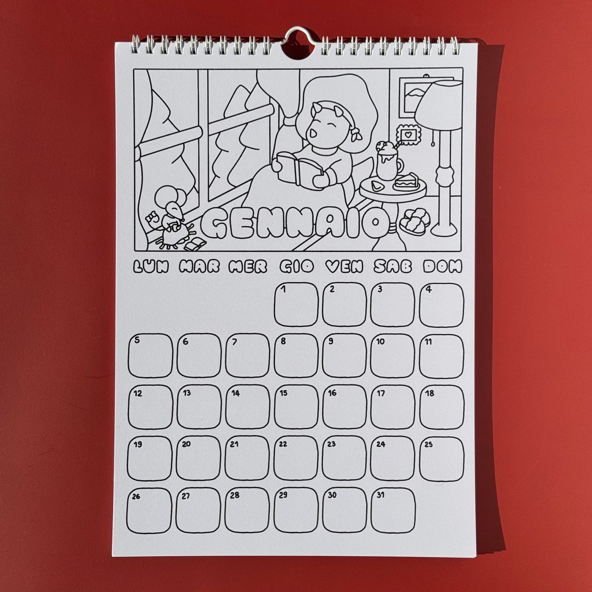 Il Calendario presenta una copertina colorata, una copertina sostitutiva da colorare e un interno completamente in bianco e nero per una personalizzazione completa.
