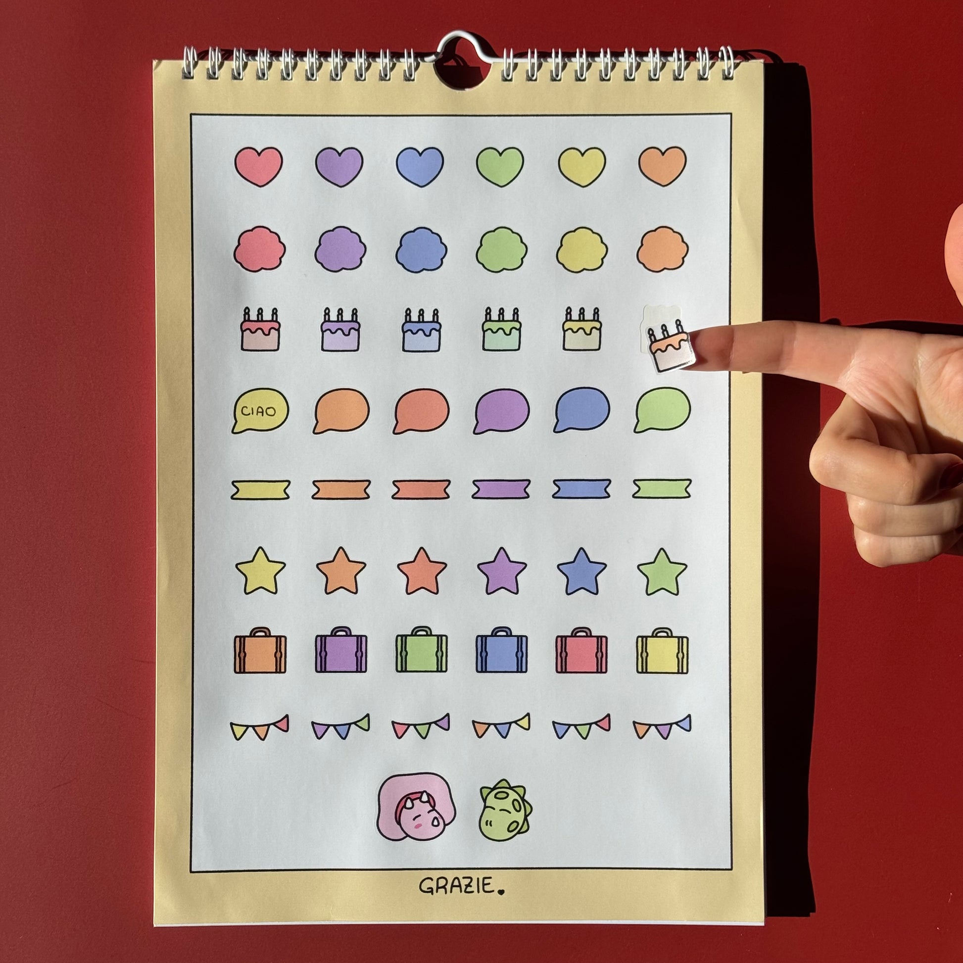 All'interno del Calen Dino troverai una pagina con 50 sticker da utilizzare per segnare date importanti come viaggi, compleanni e impegni di ogni tipo. E non solo: riceverai via mail la pagina di adesivi anche come file digitale per stamparli, ritagliarli e incollarli quante volte vuoi!